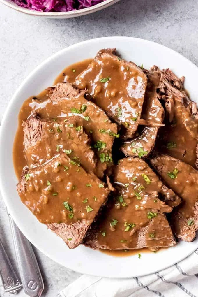 Brown meat with salt and pepper and flour in butter. Add to gravy 1 small can of tomato puree, sugar, and lemon rind and mustard. Use ginger snaps to thicken.
